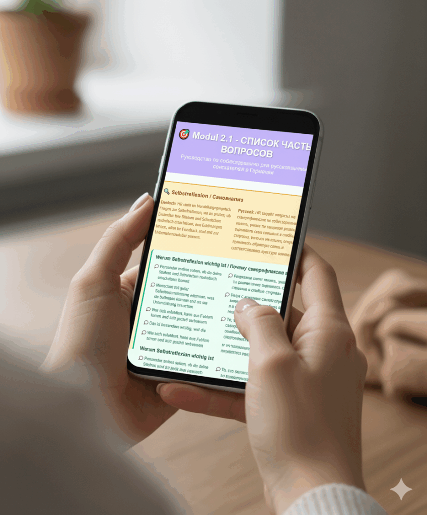 Здесь пошаговое пособие для русскоязычных мигрантов с полным переводом на двух языках, немецком и русском, помогающее найти работу в Германии, со списком полезных фраз, которые можно использовать на интервью, даже если немецкий ещё не идеален.